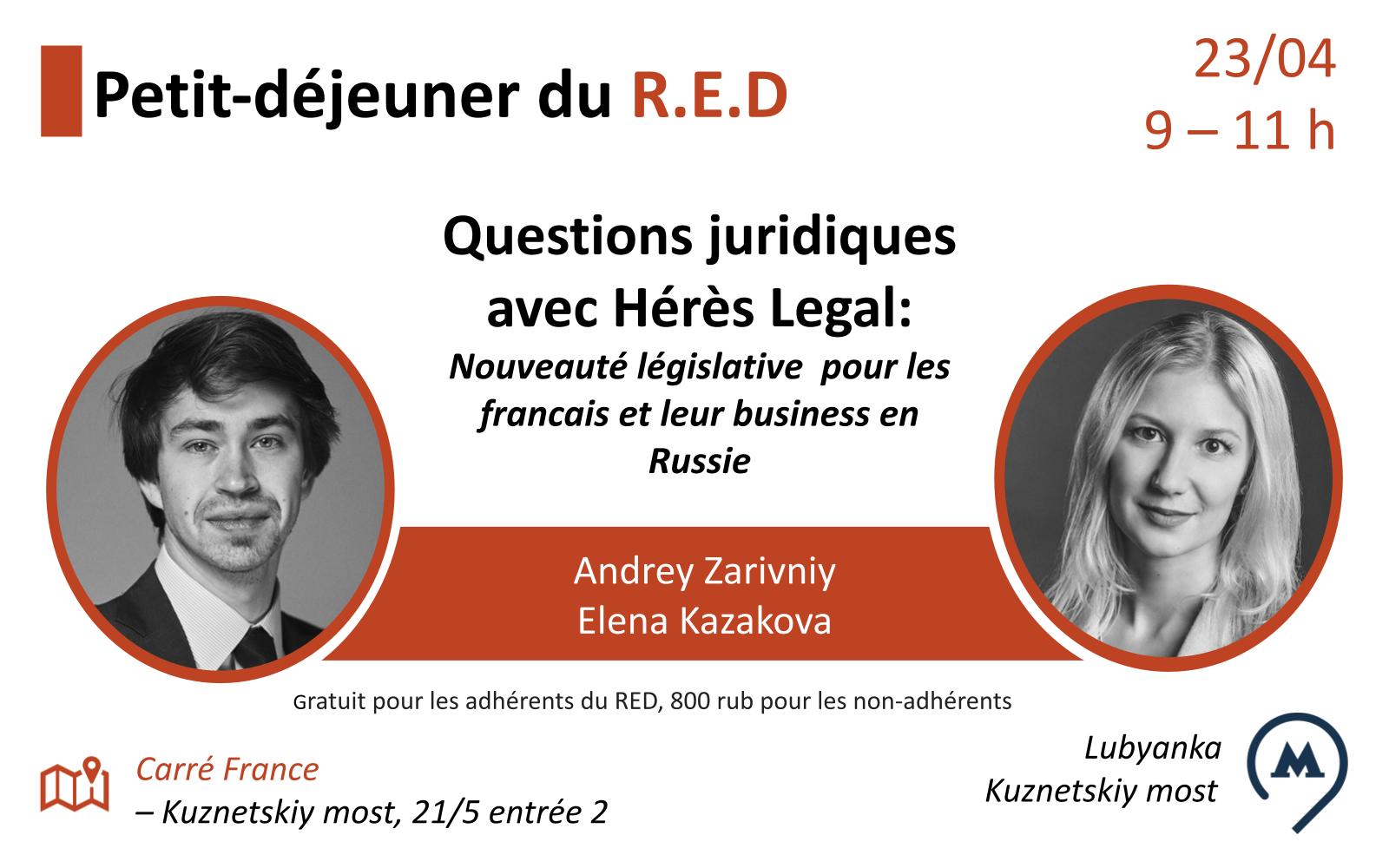 Nous vous proposons comme chaque année une rencontre consacrée aux problématiques juridiques pour les personnes physiques et morales. Les intervenants présenteront les nouveautés législatives ainsi que l’impact des dernières sanctions. Hères Legal nous expliquera les conséquences pour les français et leurs business en Russie.
